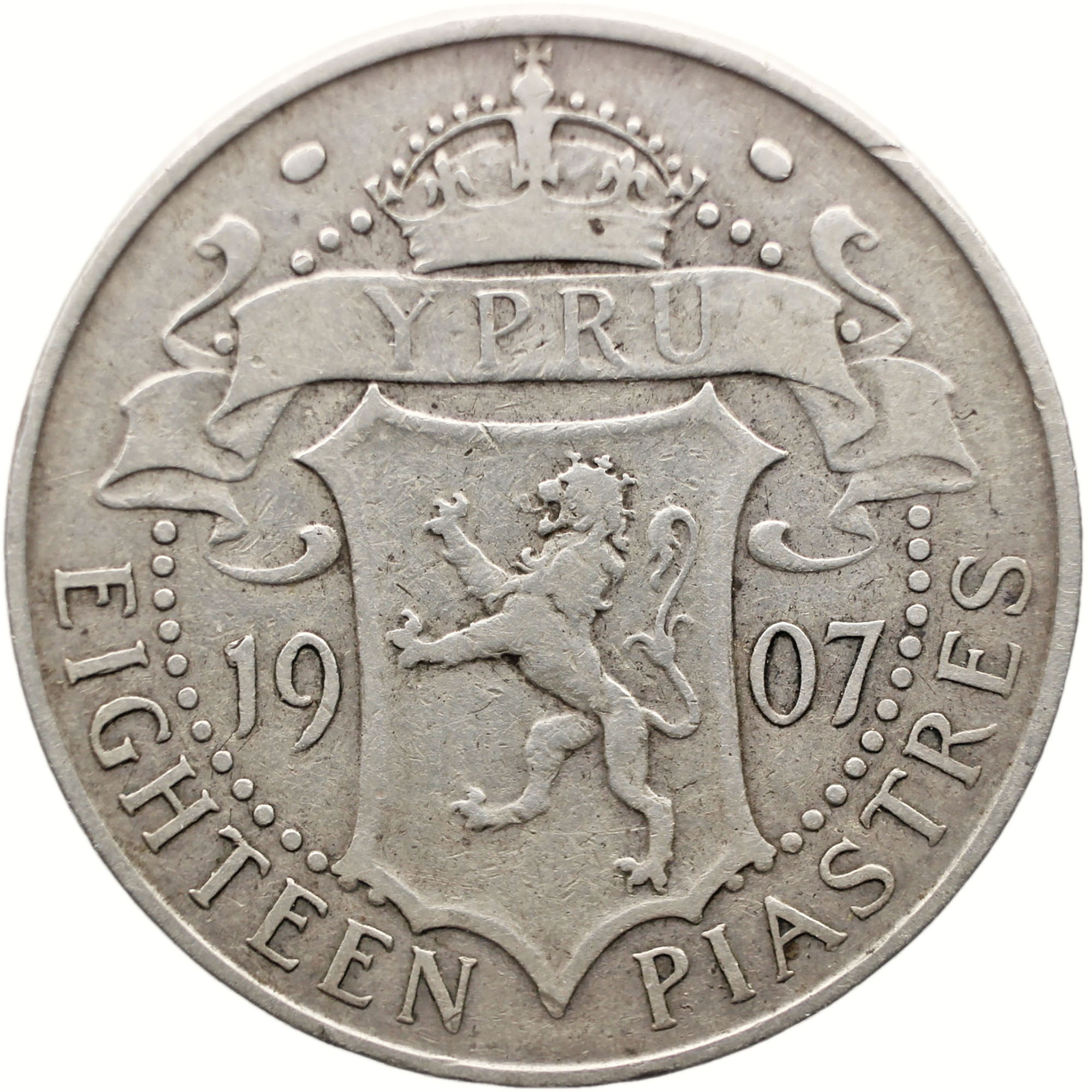 Reverse legend: CYPRUS 19 07 EIGHTEEN PIASTRES