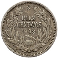 Reverse legend: DIEZ CENTAVOS 1908 So