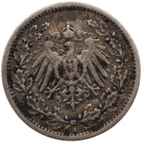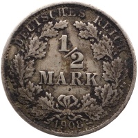 Reverse legend: DEUTSCHES REICH 1/2 MARK 1908