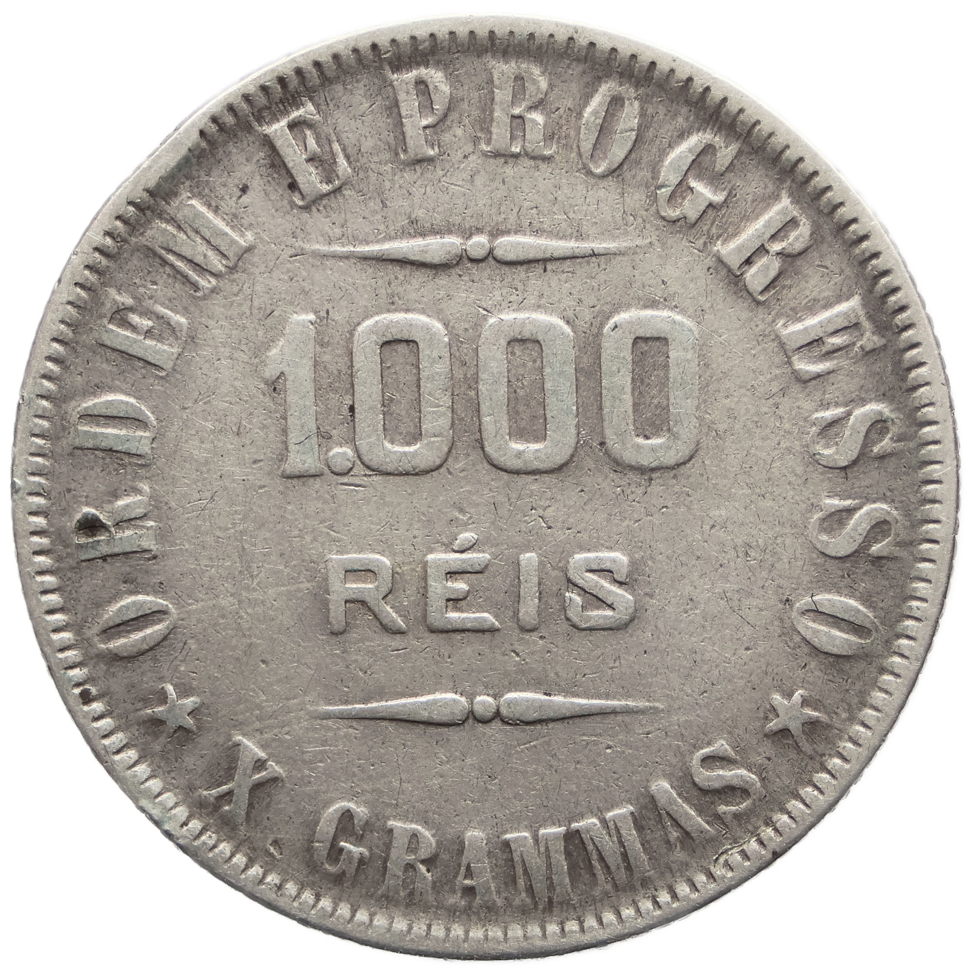 Reverse legend: ORDEM E PROGRESSO 1000 RÉIS * X GRAMMAS *