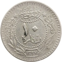 Reverse legend: دولة عثمانية ضرب في ☆ ☆ قسطنطينية ١٠ پاره ١٣٢٧
