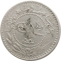 Obverse: Inside a beaded circle and above the regnal year, the tughra of the sultan next to "Reshat" ; around, the motto followed by an olive branch and a wheat sheaf knotted together.