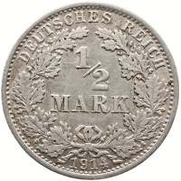 Reverse legend: DEUTSCHES REICH 1/2 MARK 1914