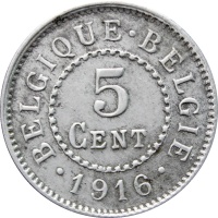 Reverse legend: “BELGIQUE • BELGIE 5 CENT • 1916 •”