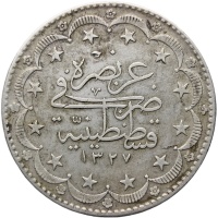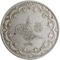 Obverse: Tughra beneath stars and above regnal year, wreath, and value with "el-Ghazi" to the right.
