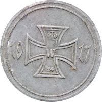 Obverse: Rope rim, German Iron Cross dividing date with crown, W, and 1914 within cross