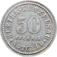 Reverse legend: “BEZIRK KÜNZELSAU ∙ NOTGELD ∙ 50 PFENNING”
