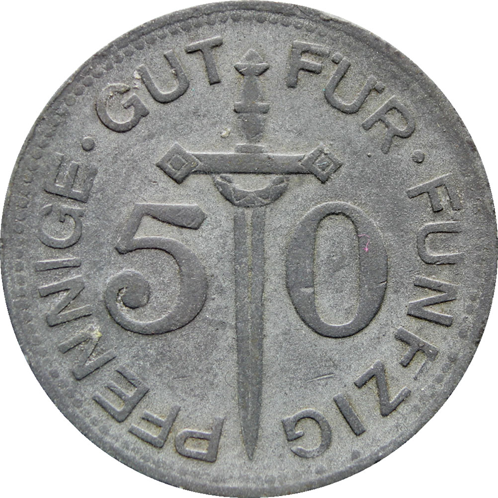 Reverse legend: “GUT FÜR・FÜNFZIG PFENNIGE・”