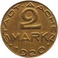 Reverse legend: STADT ∙ AACHEN 2 MARK ∙ 1920 ∙