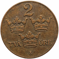 Obverse: Crowned double monogram of King Gustaf V of Sweden divides date. King's motto around