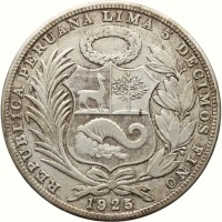 Obverse legend: REPUBLICA PERUANA LIMA 5 DECIMOS FINO 1925