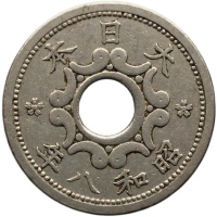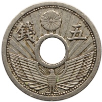 Obverse: Chrysanthemum Flower (Coat of Arms & Emperor's Royal Seal) and the value divided by the center hole along with a stylized eagle with spread wings and rays in the background at the bottom