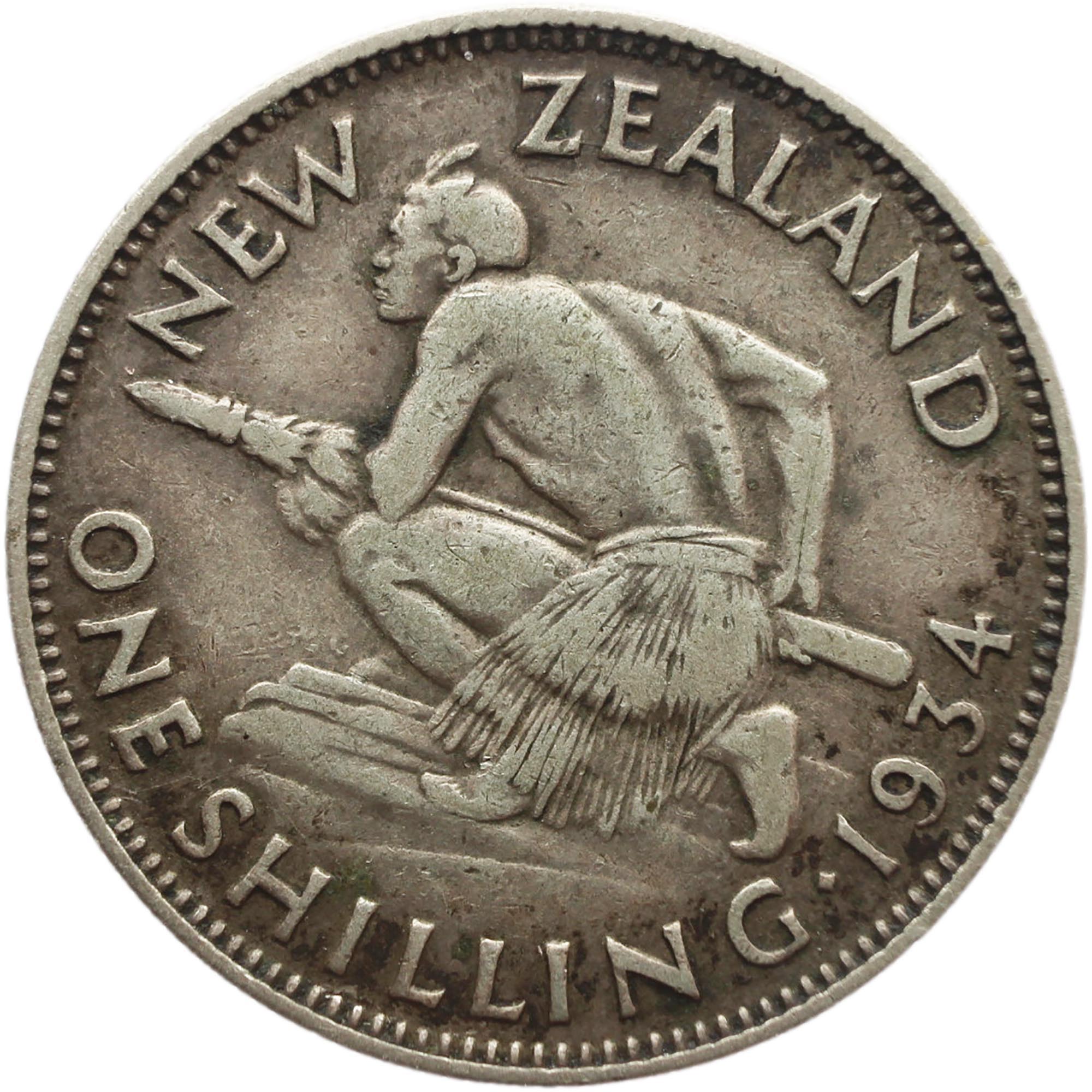 Reverse legend: NEW ZEALAND KG ONE SHILLING·1934