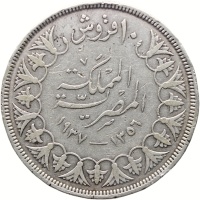 Reverse legend: ١٠ قروش المملكة المصرية ١٣٥٦ - ١٩٣٧