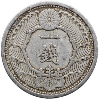 Obverse: Top: Chrysanthemum Flower (Coat of Arms & Emperor's Royal Seal) Centre: Value within a Floral design Bottom: Paulownia Flower (Government Seal of Japan)