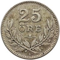 Reverse: Value on two lines with below the symbol of Stockholm Mint, all surrounded by laurel branch.