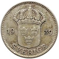 Obverse: Crowned shield with the three crowns of Sweden divides date at sides. Below the name of the country.