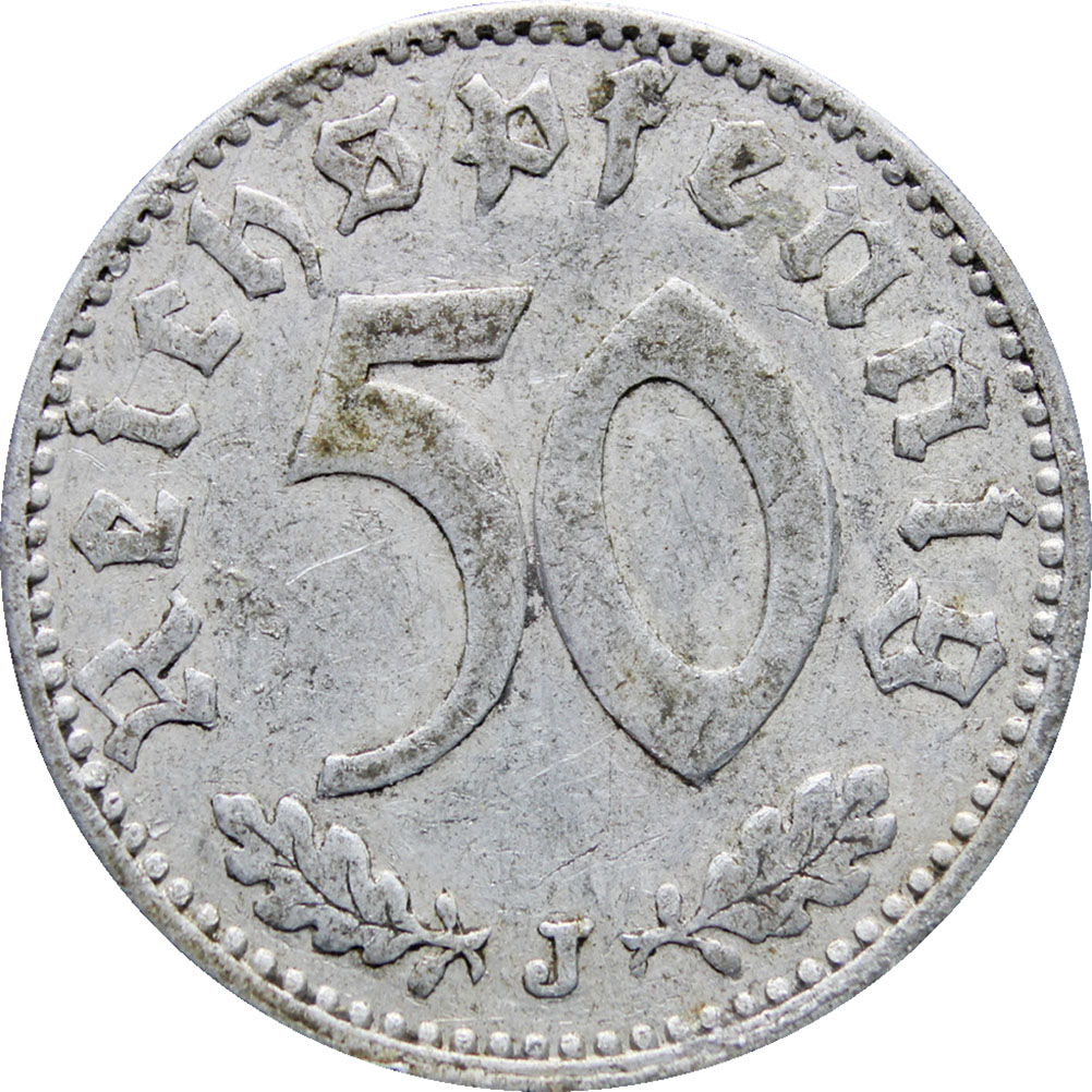 Reverse: value and two oak leaves, mintmark J, below 50 between leaves.
