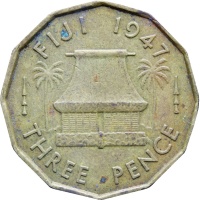 Reverse legend: “FIJI 1947 THREE PENCE”