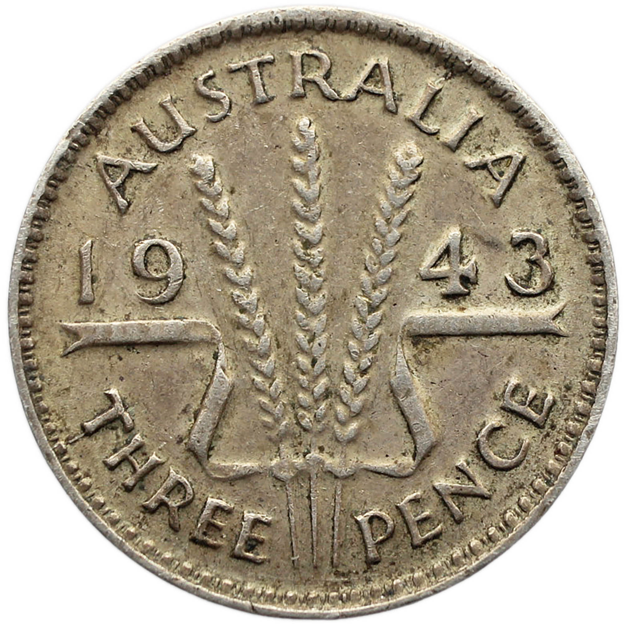 Reverse legend: AUSTRALIA 19 43 K G THREE PENCE