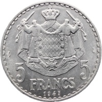 Reverse: The crowned mantled arms of Monaco with the denomination above the date below