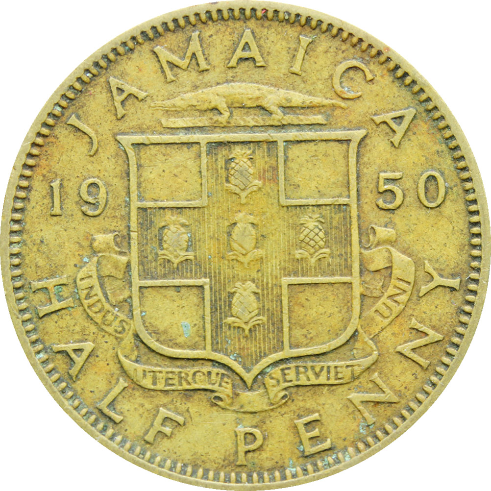 Reverse legend: “JAMAICA 19 50 HALF PENNY”