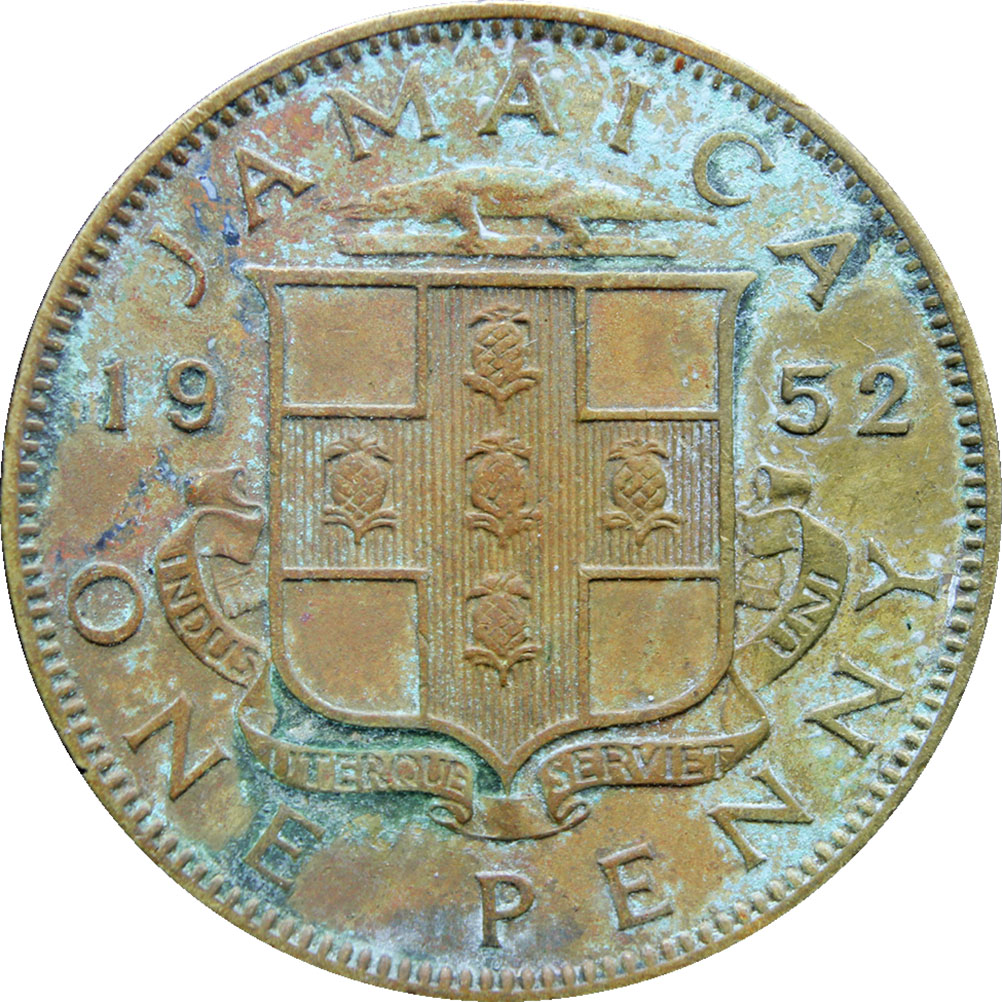Reverse legend: “JAMAICA 19 52 ONE PENNY”