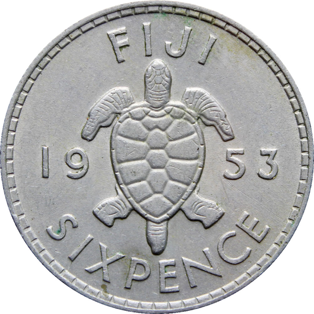 Reverse legend: “FIJI 19 53 SIXPENCE”