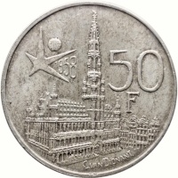Reverse: Grand Plache or Grote Markt of Brussels with Town Hall. Emblem of World's Fair with year at left. Value at right, designer below.