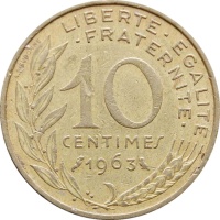 Reverse legend: “LIBERTEEGALITE FRATERNITE 10 CENTIMES 1963 A. DIEUDONNE”