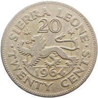Reverse legend: “·SIERRA LEONE· 20 1964 TWENTY CENTS”