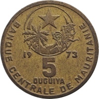 Obverse legend: 19 73 5 OUGUIYA BANQUE CENTRALE DE MAURITANIE