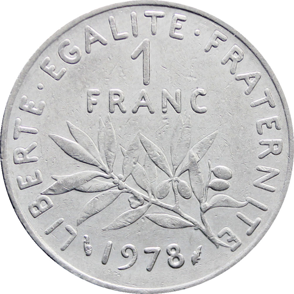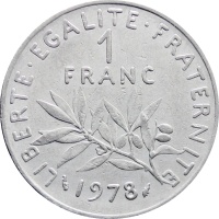 Reverse legend: “LIBERTEEGALITEFRATERNITE 1 FRANC 1978” dolphin privy mark