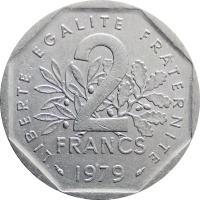 Reverse legend: “LIBERTEEGALITEFRATERNITE 2 FRANCS 1979” dolphin mark