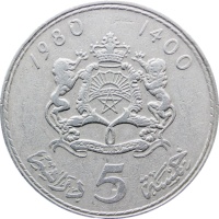 Reverse legend: “1980 1400 خمسة 5 دراهميه”