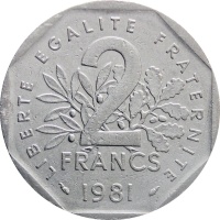 Reverse legend: “LIBERTE·EGALITE·FRATERNITE 2 FRANCS 1981” dolphin mark