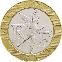 Obverse: A representation of the Génie de la Liberté, a sculpture located at the top of the "July Column" in Paris, is flanked with the letters R and F, the initials of the French Republic.