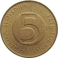 Obverse legend: REPUBLIKA SLOVENIJA PET TOLARJEV 5 1992