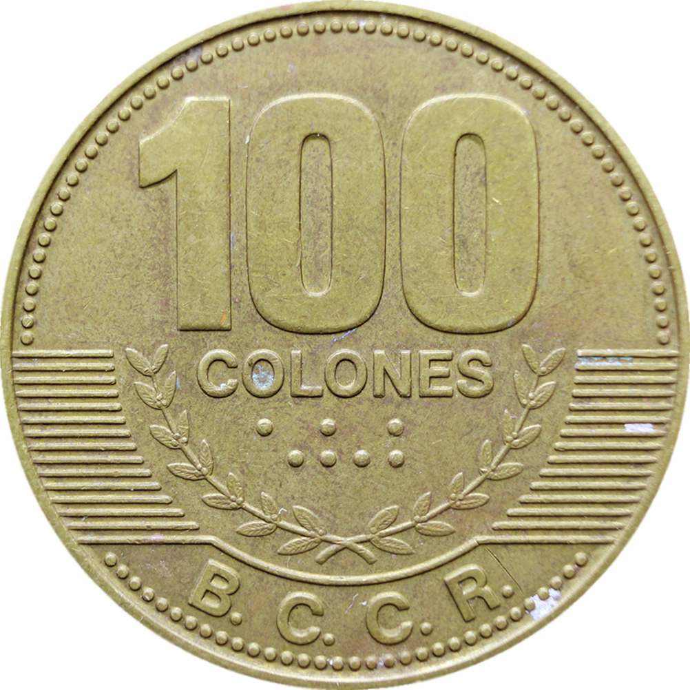 Reverse legend: “100 COLONES ⠁⠚⠚ B.C.C.R.”