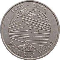 Reverse: The reverse of the coin depicts scenes from the Battle of Zalgiris with details of weapons.