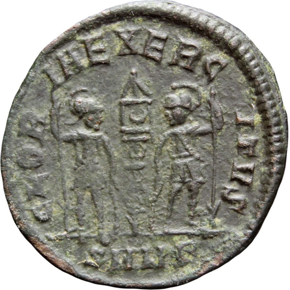 Reverse: two soldiers standing facing, flanking a single standard in centre, heads confronted, each holds a spear in outer hand and rests inner hand on grounded shield