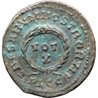 Reverse: Votive Legend on 2 lines VOT / X, within Inscribed Wreath (CAESARVM NOSTRORVM), dot in badge at top of Wreath, PLGC in ex;
