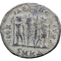 Reverse: two soldiers standing facing, flanking two standards in centre, heads confronted, each holds a spear in outer hand and rests inner hand on grounded shield, dot on banners