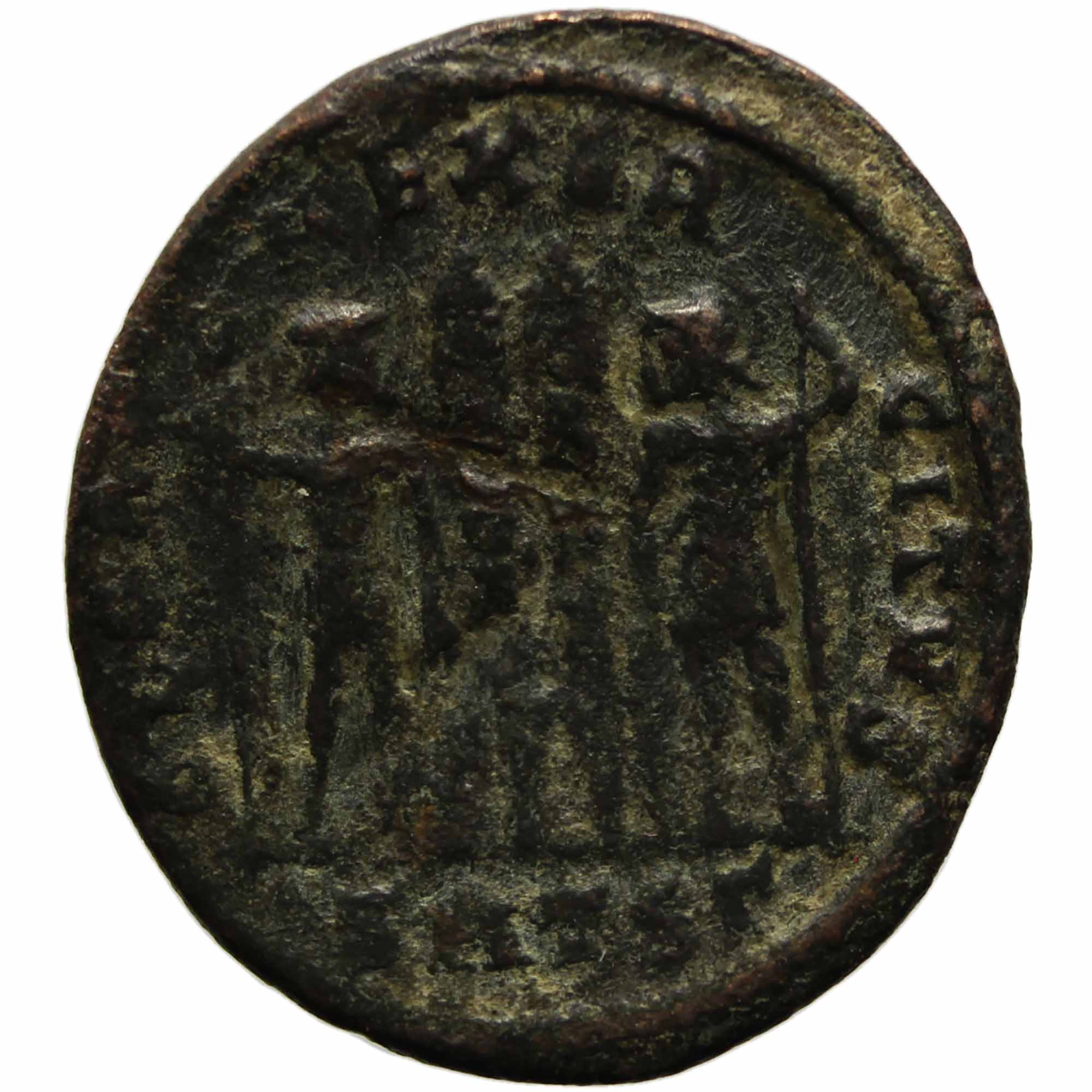 Reverse: two soldiers standing facing Two standards in centre, heads confronted, each holds a Spear in outer hand and rests inner hand on grounded Shield, o on Banners, SMTSΓ in ex.