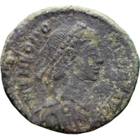 Obverse: Pearl-diademed, draped, and cuirassed bust Theodosius I facing right.