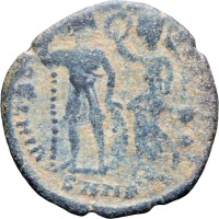 Reverse: emperor standing left, head right, holding spear and resting left hand on shield. Victory, standing beside him crowns him with a wreath held in her right hand.