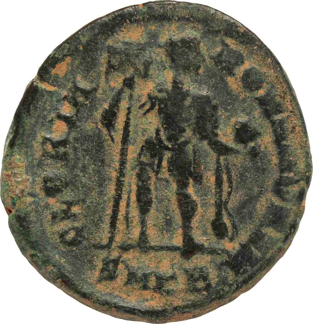Reverse: Emperor standing facing, head right holding labarum and globe