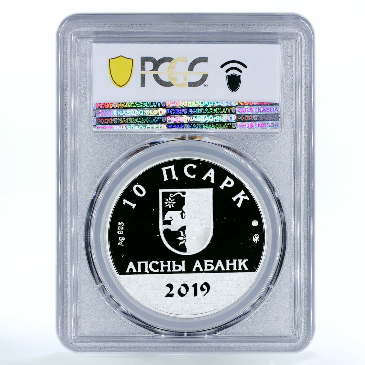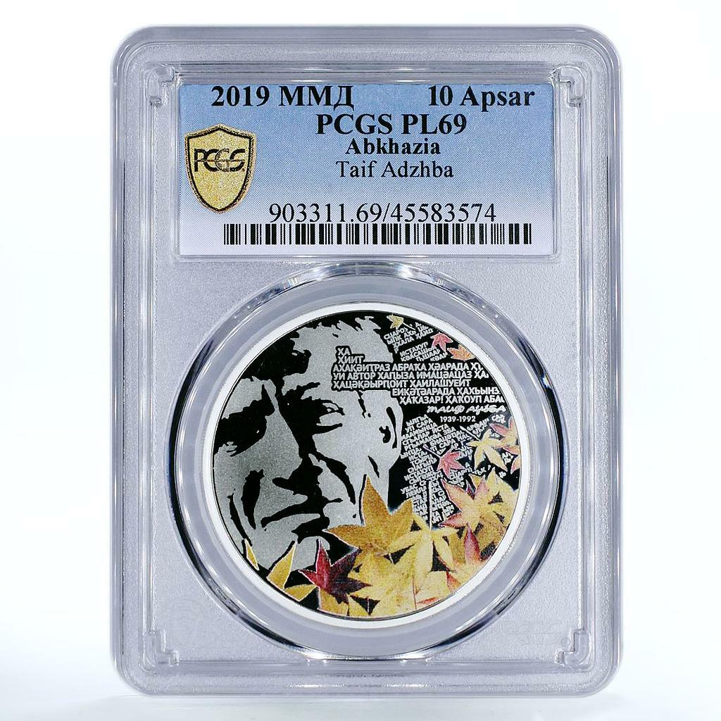 Abkhazia 10 Apsars 2019 Silver Coin – Taif Adzhba, Outstanding Personalities. Prooflike issue, Ag 925 silver, graded PCGS PL69. Obverse: coat of arms of Abkhazia with horseman, bow, sun, star, denomination 10 ПСАРК, inscription АПСНЫ АБАНК, year 2019. Reverse: portrait of Taif Adzhba (1939–1992), stylized text of his poetry, colorful autumn maple leaves. Adzhba is remembered as a great Abkhazian poet and writer whose works reflected national identity, homeland, and human destiny. Theme: literature, poetry, culture, national heritage, famous personalities. Perfect for collectors of certified silver coins, literary commemoratives, and rare world numismatics. Add this 10 Apsars Taif Adzhba coin to your collection today!
