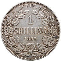 Reverse: Within a wreath of oak, 1 / SHILLING / 1897; around above, Z. AFRIK. REP.