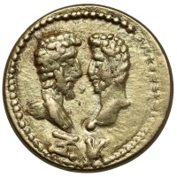 Bareheaded and draped bust of Marcus bare head of Lucius facing each other; club (or spear?) between.